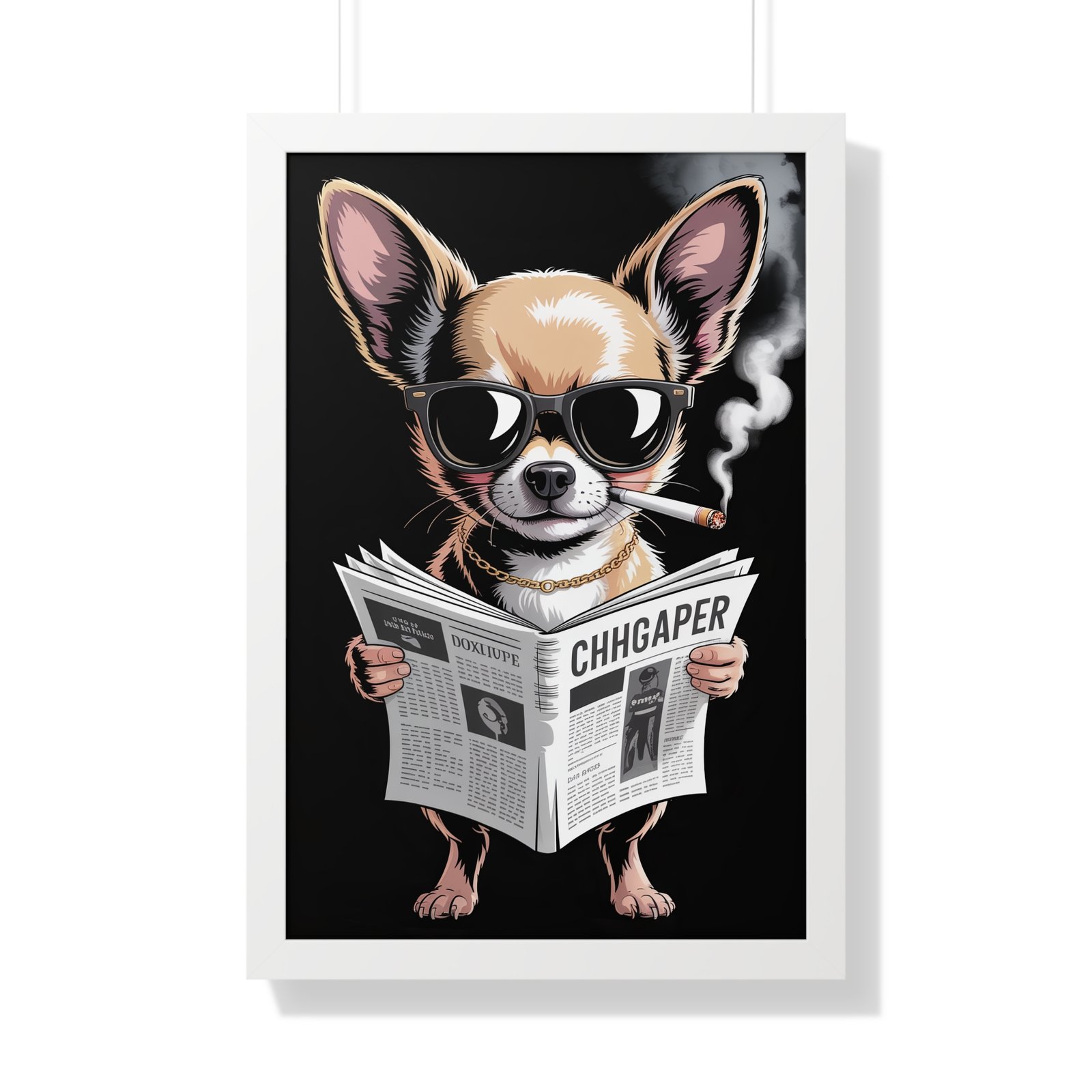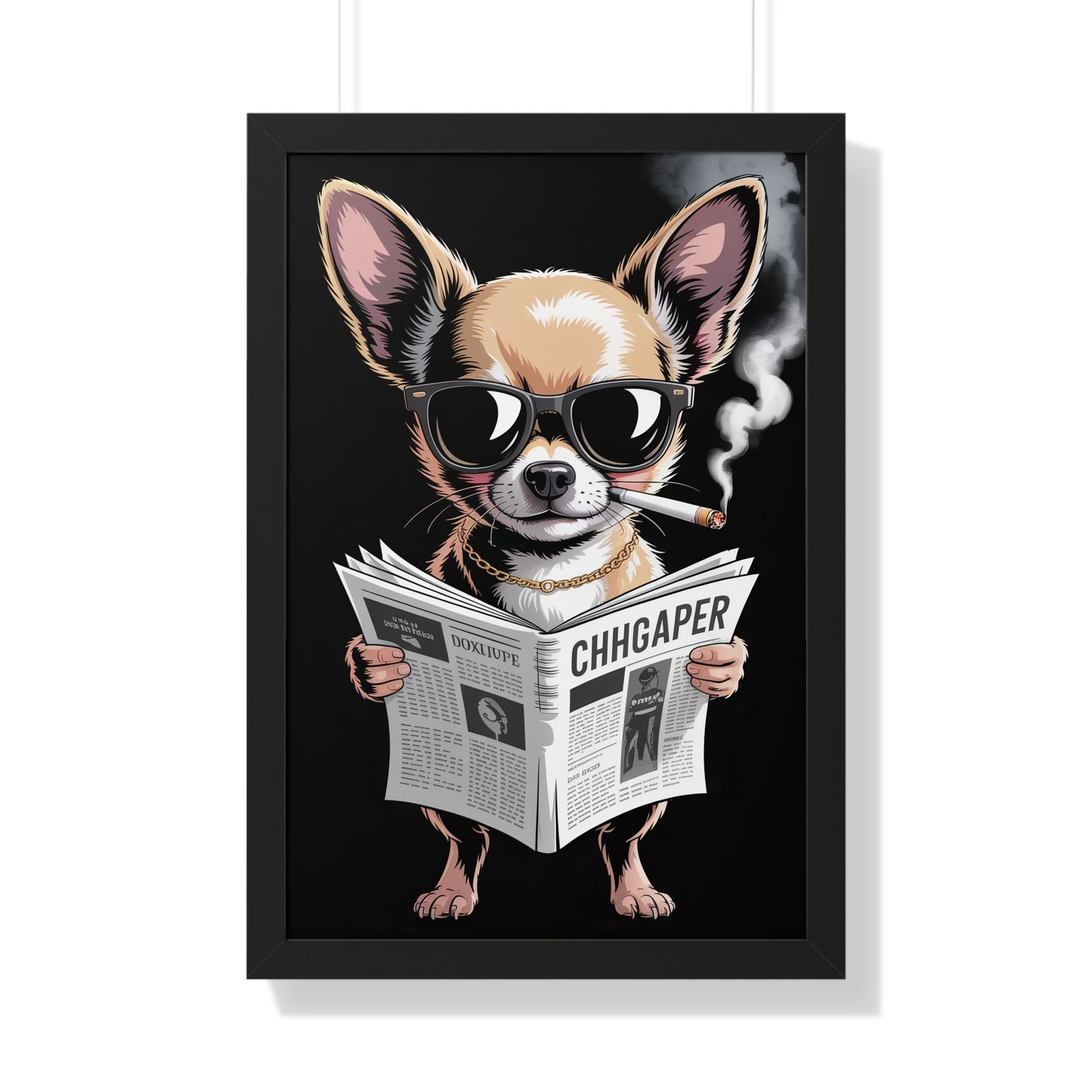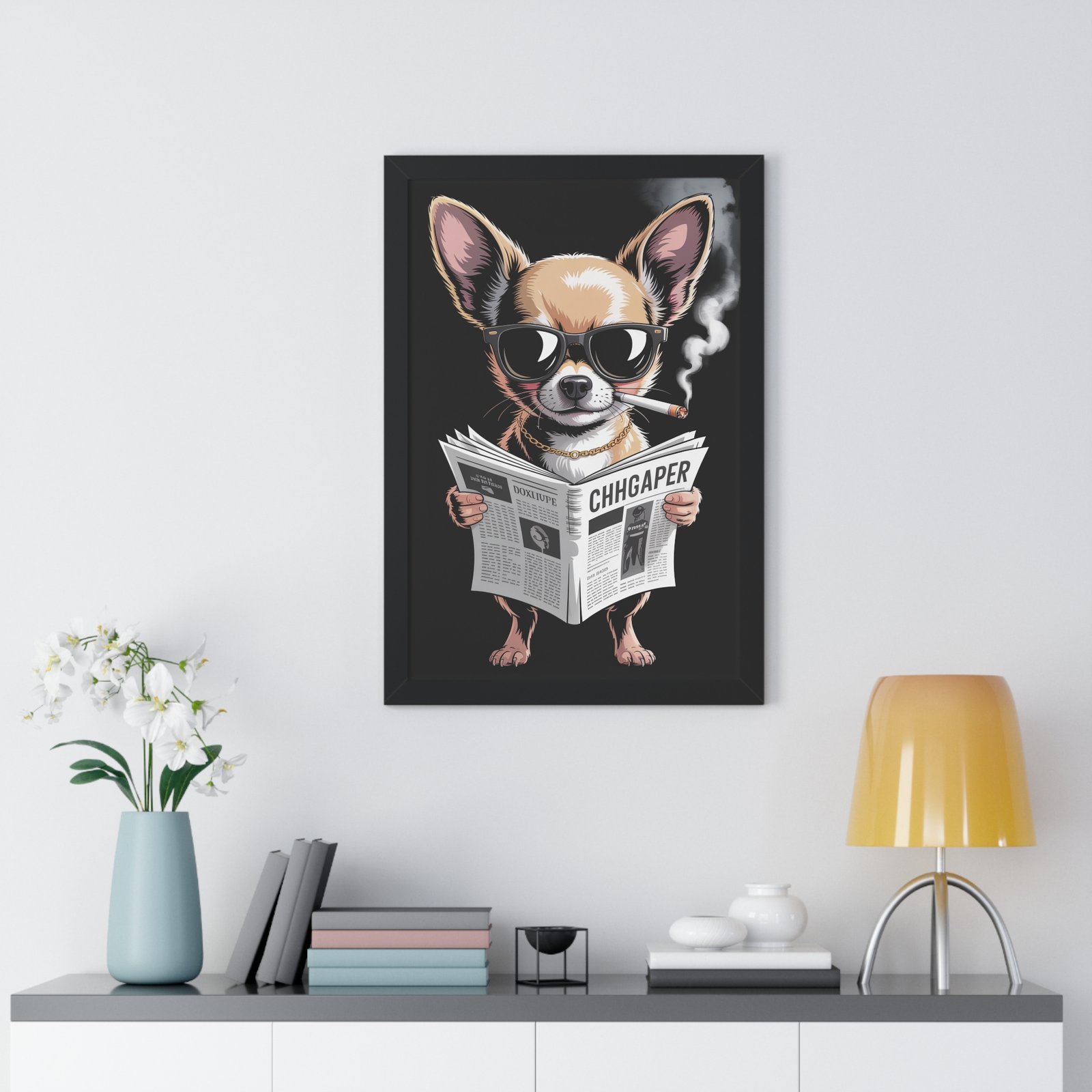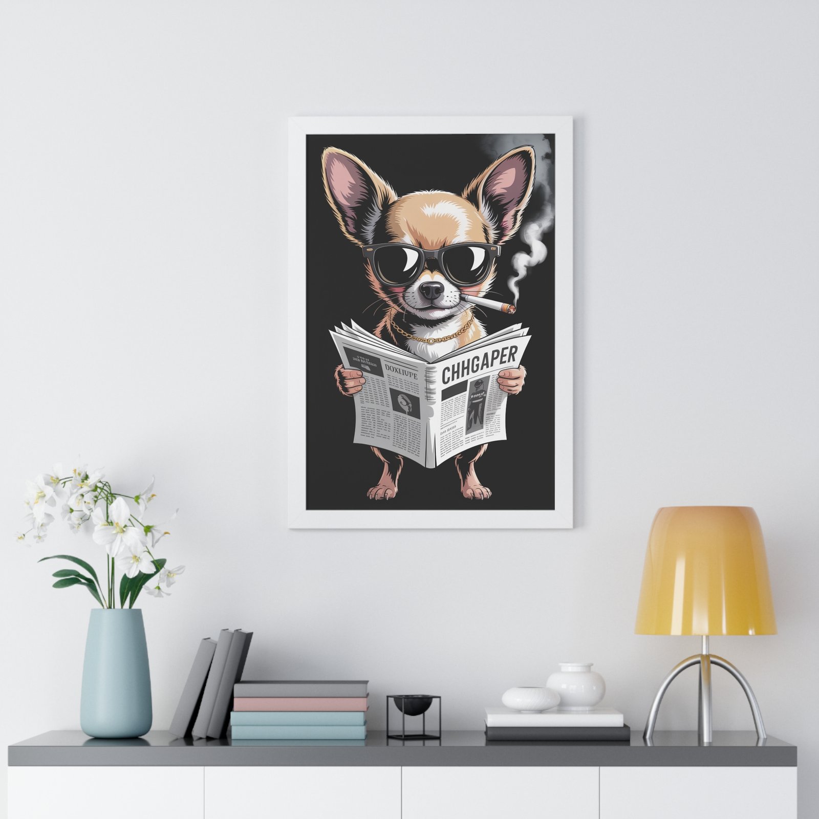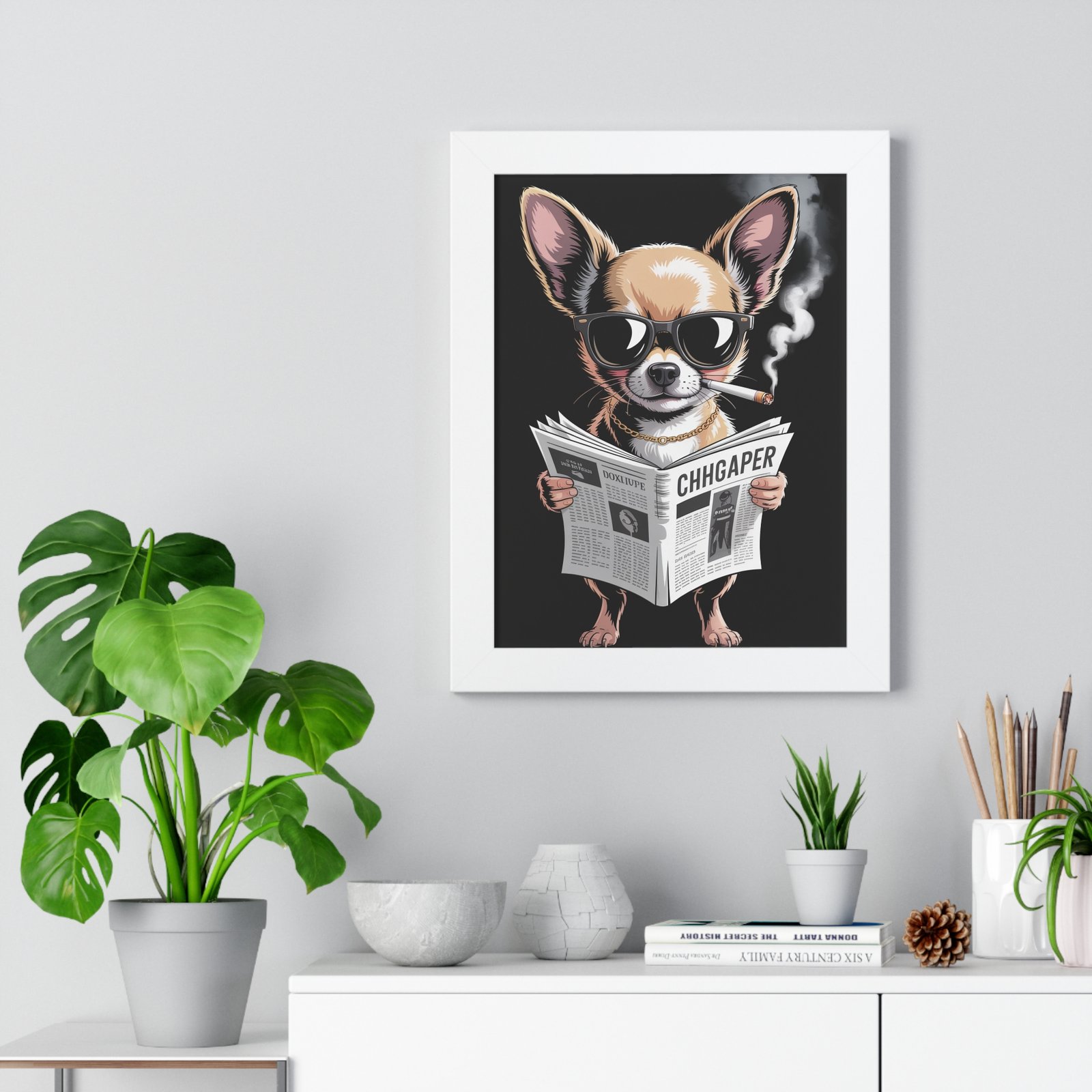 A framed vertical poster that brings playful personality to your wall. The print shows a sunglasses-wearing chihuahua reading a newspaper, set against a deep black background that makes the colors pop. The museum-quality matte paper holds crisp detail and resists yellowing over time. Choose a sleek black, warm walnut, or clean white frame—either durable MDF or lightweight Ayous wood—finished with a protective acrylic cover. Built-in or included hanging hardware makes it simple to display in a hallway, home office, or living room. This piece adds a cheeky, artful touch for dog lovers and anyone who likes a dash of humor in their decor.