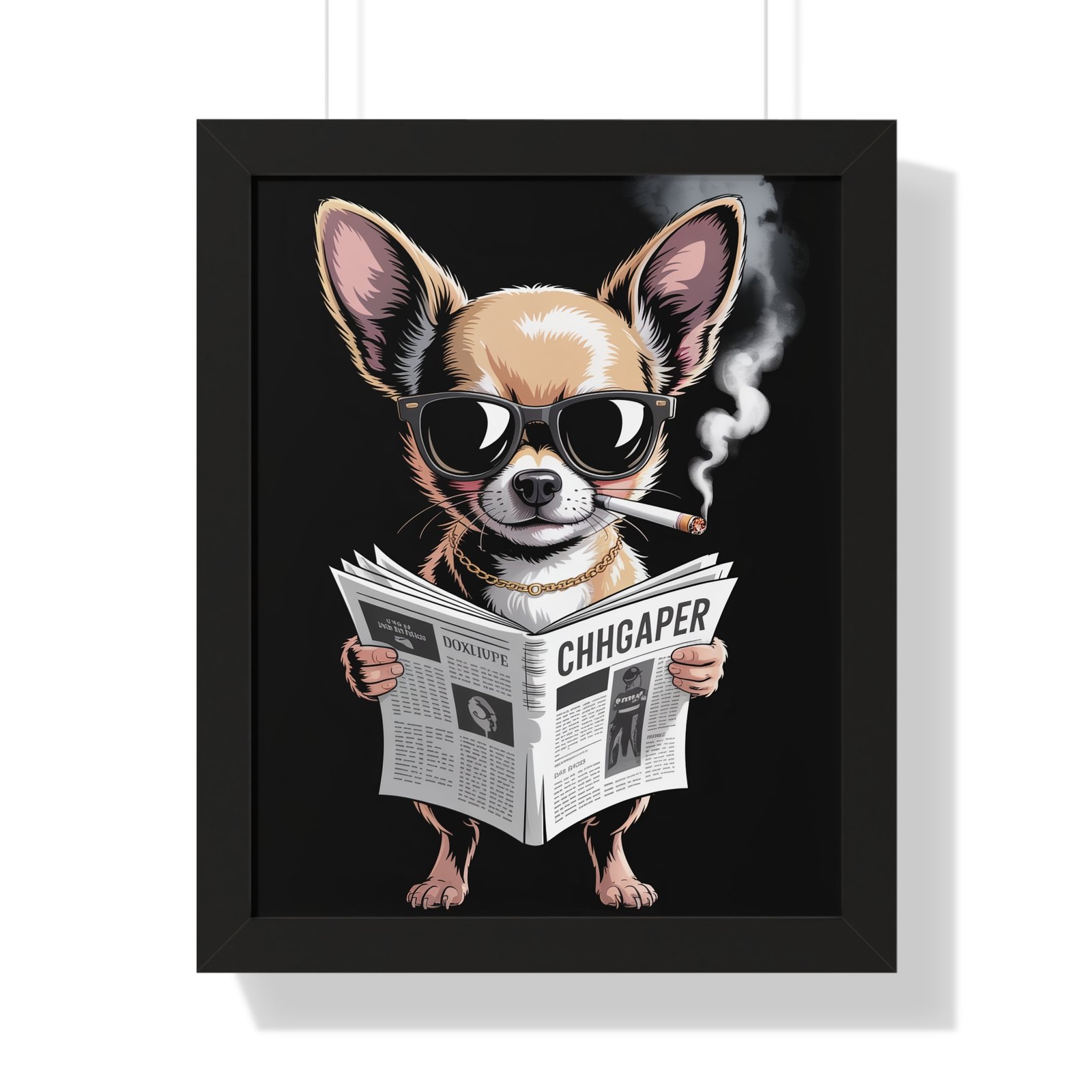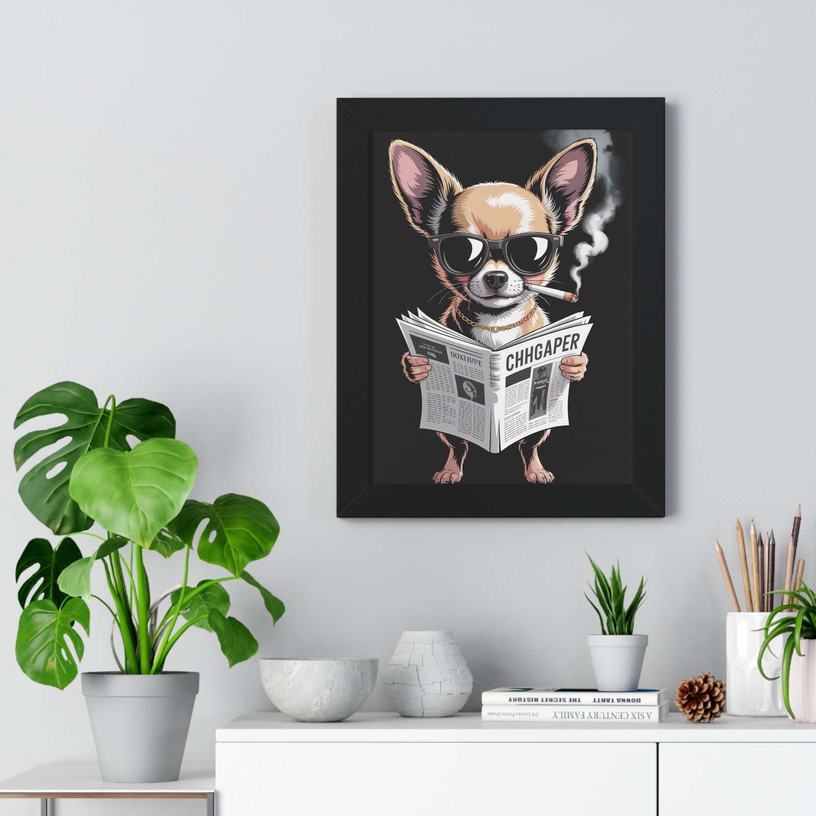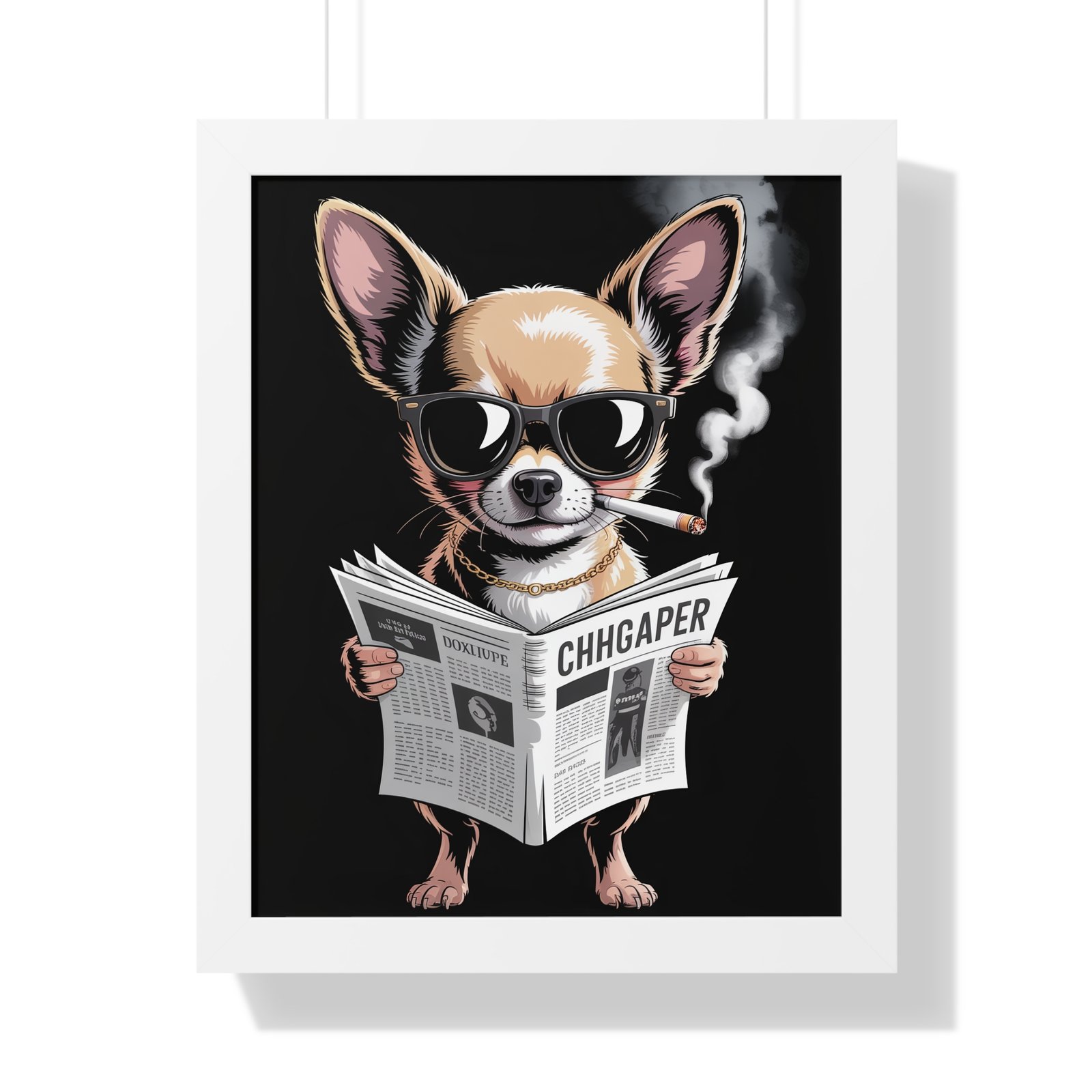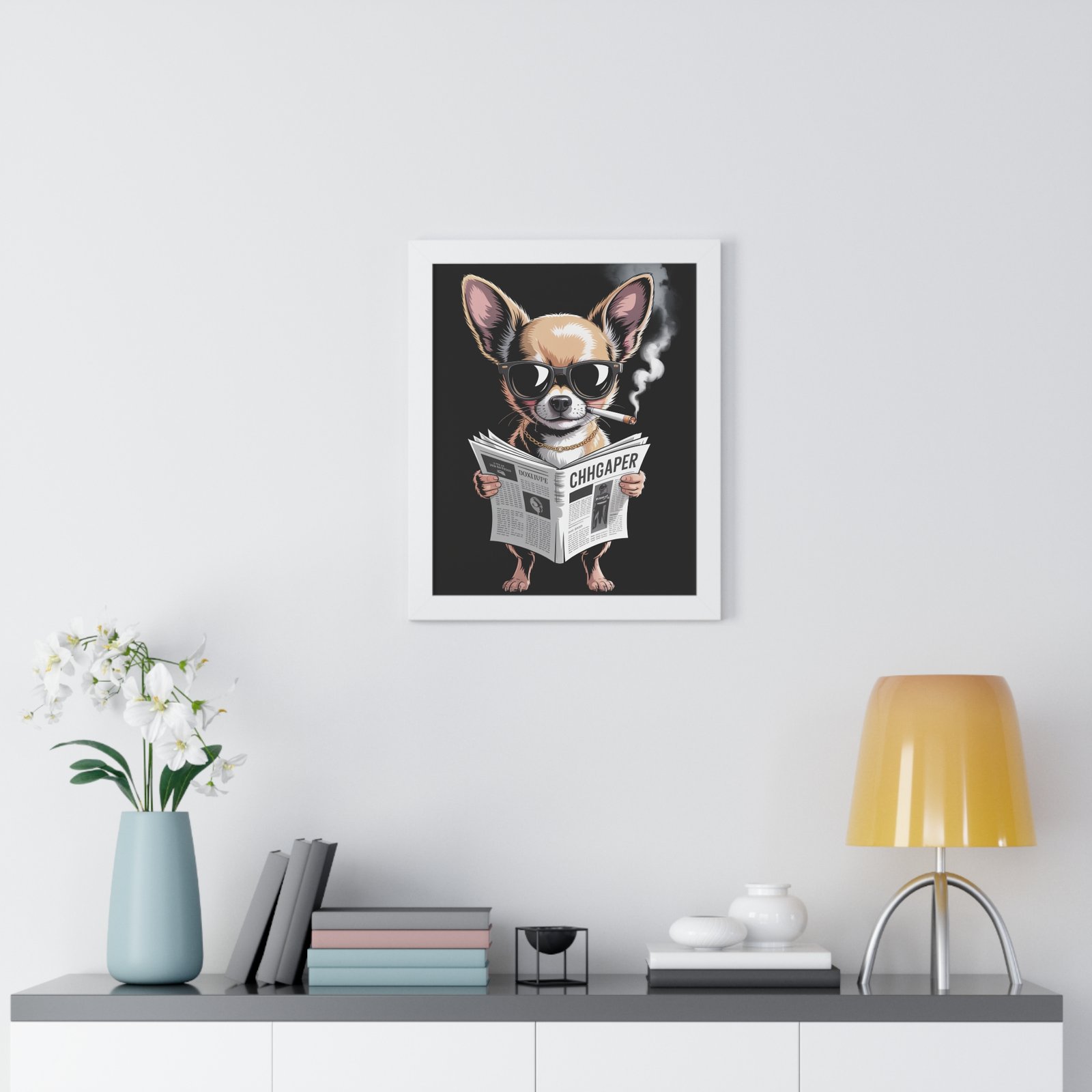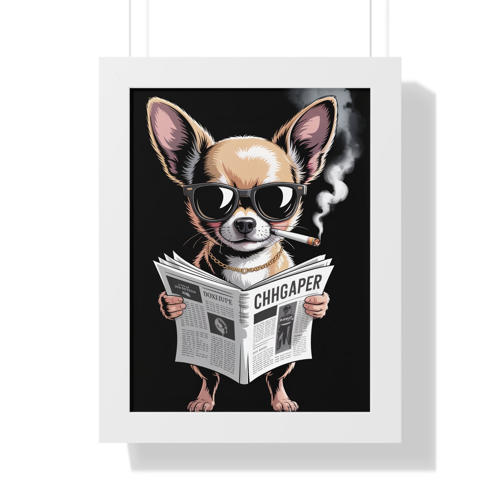 A framed vertical poster that brings playful personality to your wall. The print shows a sunglasses-wearing chihuahua reading a newspaper, set against a deep black background that makes the colors pop. The museum-quality matte paper holds crisp detail and resists yellowing over time. Choose a sleek black, warm walnut, or clean white frame—either durable MDF or lightweight Ayous wood—finished with a protective acrylic cover. Built-in or included hanging hardware makes it simple to display in a hallway, home office, or living room. This piece adds a cheeky, artful touch for dog lovers and anyone who likes a dash of humor in their decor.
